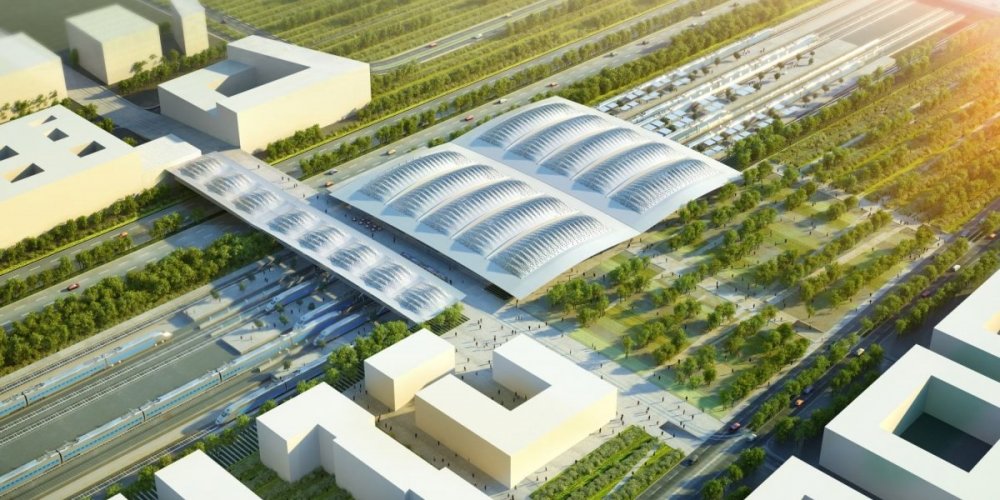 Vue aérienne de la future gare TGV Montpellier Sud de France. Image de synthèse : AGENCE MIMRAM / IDA+ (présentation le 24/07/2014)