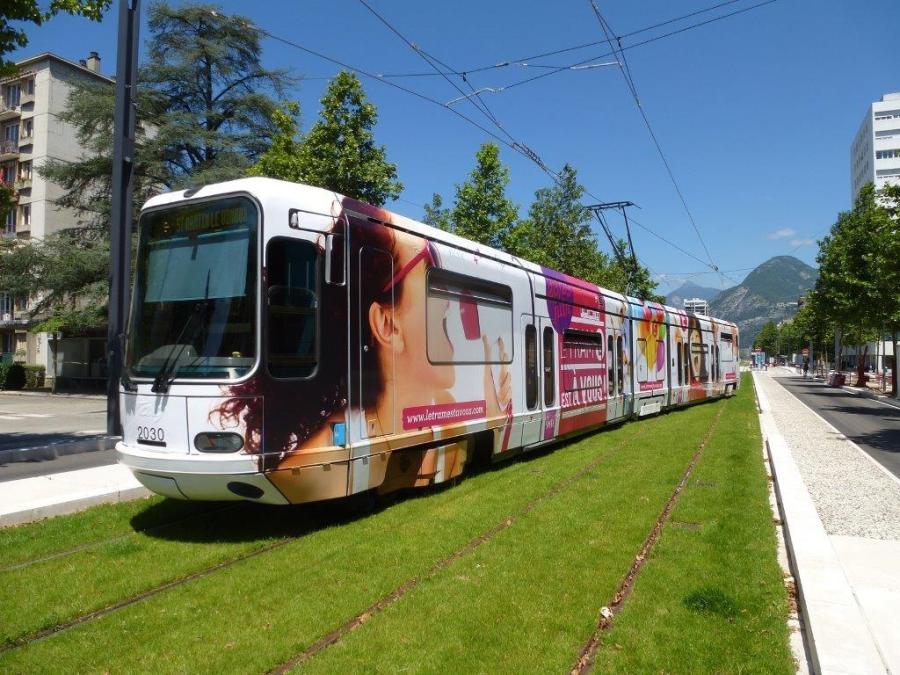 La rame 2030 TFS Alsthom, habillée d’une livrée spéciale inauguration, est photographiée alors qu’elle quitte sa voie en tiroir au sud du terminus « Louise Michel » de la ligne E à Grenoble, le mardi 15 juillet 2014. Copyright : Louis Ferdinand