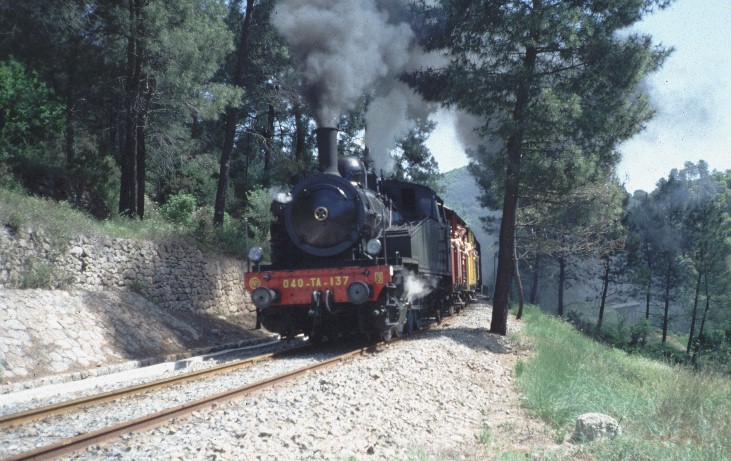 A toute vapeur du côté de Corbès sur la ligne touristique Anduze – St-Jean-du-Gard, le lundi 31 mai 1993, locomotive 040 TA 137 en tête. Copyright : Edouard Paris