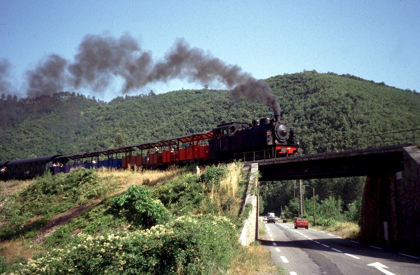 A Thoiras, le Train à Vapeur des Cévennes passe au dessus de la départementale, le samedi 1er juillet 1995, locomotive 030T 8158 SACM en tête. Copyright : Edouard Paris