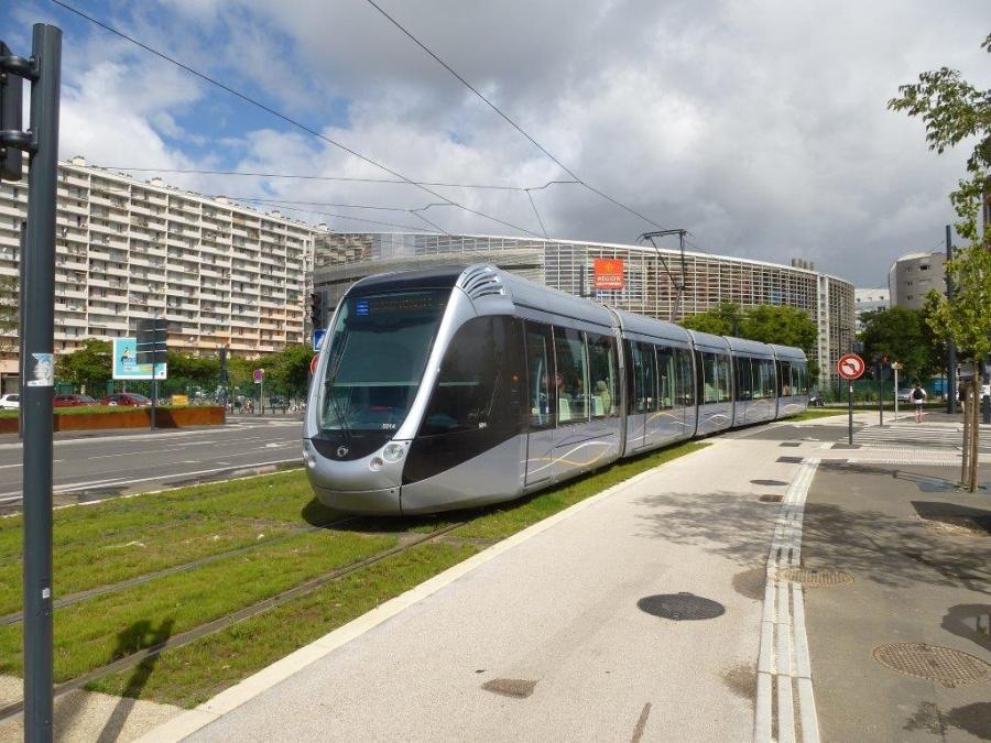 La rame 5014 Citadis 302 Alstom est photographiée entre les stations « Déodat de Séverac » et « Arènes », le mercredi 13 août 2014. Copyright : Louis Ferdinand