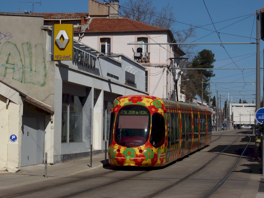 La rame 2048 Citadis 302 Alstom à la livrée fleurie pop art est photographiée rue de Substantion à Montpellier, le 6 mars 2010. Copyright : Edouard Paris