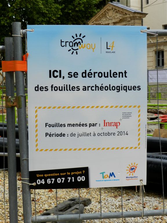 Panneau annonçant le chantier des fouilles archéologiques, place Albert 1er à Montpellier, photographié le vendredi 22 août 2014. Copyright : Anje34