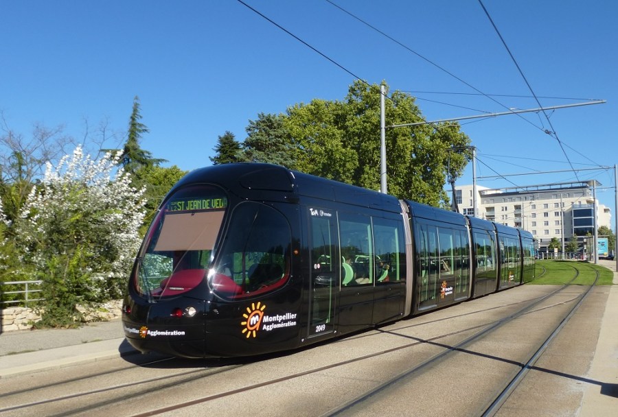 La rame 2049 Citadis 302 Alstom à la livrée multiligne en service commercial sur la ligne 2, le mercredi 27 août 2014, vue entre les stations « Général de Gaulle » et « Saint-Lazare ». Copyright : Louis Ferdinand