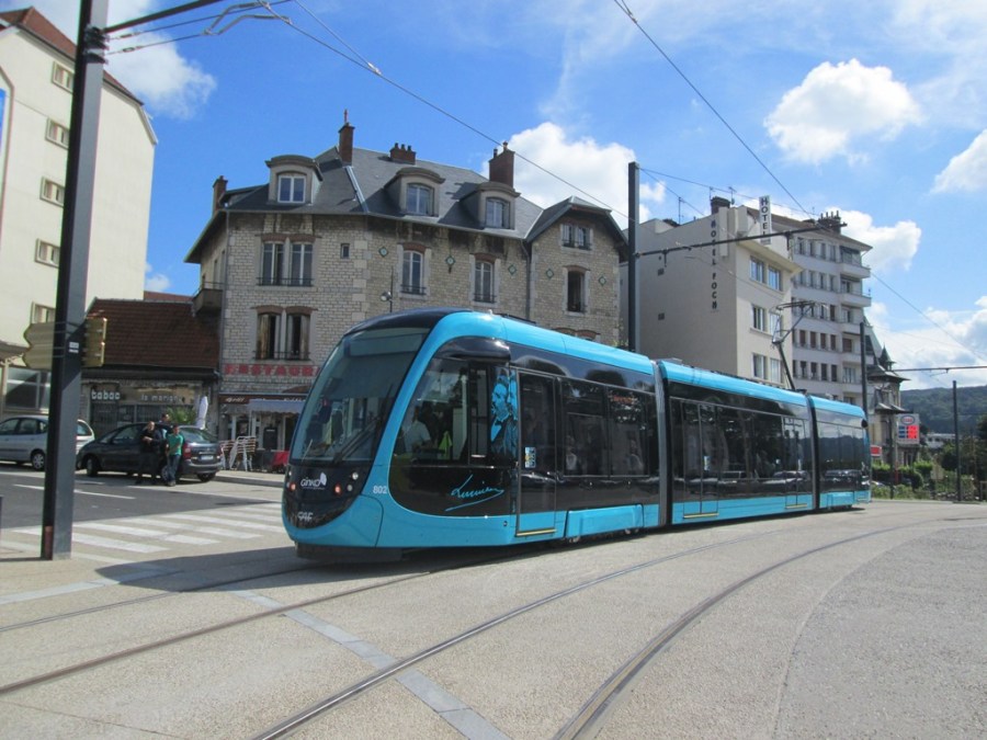 A Besançon, la rame 802 Urbos 3 CAF baptisée « Frères Lumières » approche du terminus du T2 « Gare Viotte », le samedi 30 août 2014. Copyright : Alain Masson