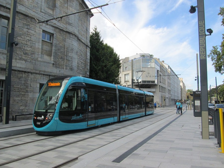 A Besançon, la rame 812 Urbos 3 CAF, en direction du terminus « Chalezeule » du T1, marque l’arrêt à la station « République », le samedi 30 août 2014. Copyright : Alain Masson