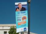 - Banderole d’autosatisfaction de Philippe Saurel « Le tram pour tous 1 € Engagement tenu ! » . Photo prise place Paul-Bec à Montpellier, le samedi 13 septembre 2014. Copyright : Edouard Paris