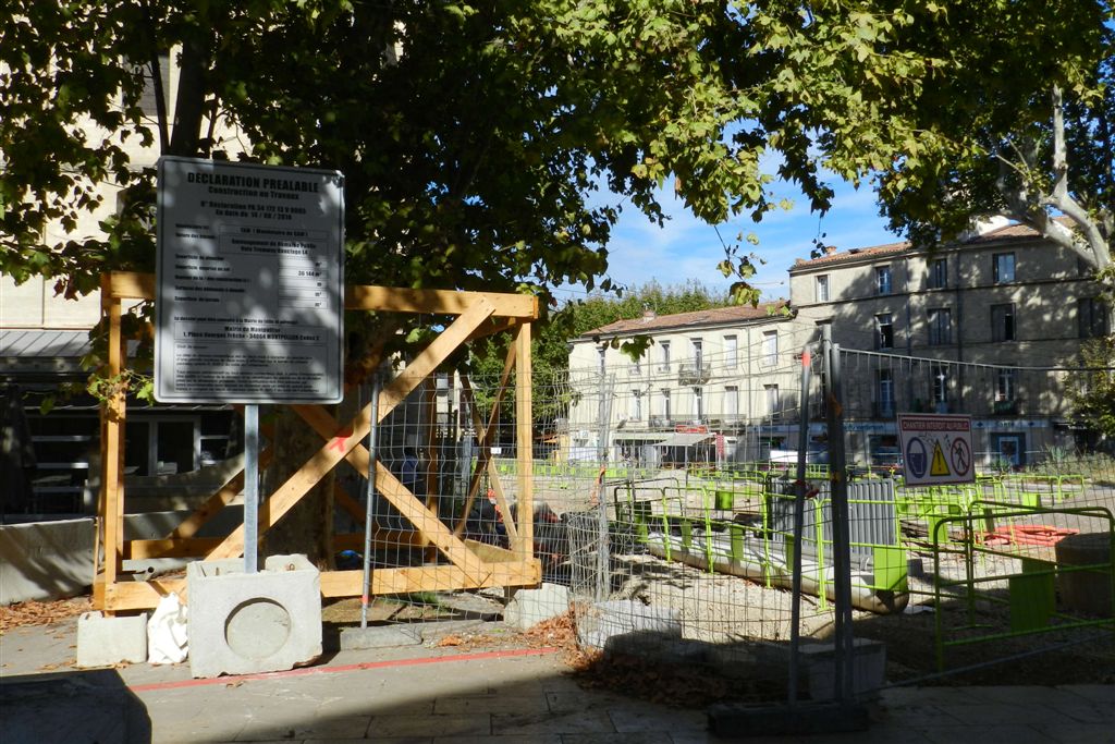 Place Albert 1er à Montellier, un panneau installé pour annoncer l’aménagement du domaine public voie tramway bouclage ligne 4 . Photo prise le dimanche 21 septembre 2014. Copyright : Anje34