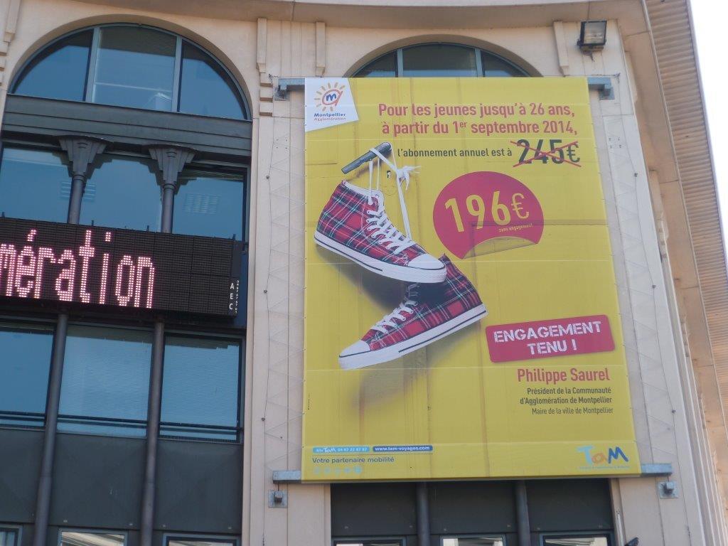 Pub TaM XXL fixée à une partie de façade de l’Hôtel d’Agglomération, place de Zeus à Montpellier. Photo prise le samedi 27 septembre 2014. Copyright : Edouard Paris