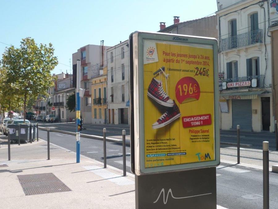 Pub TaM sur une sucette JCDecaux, avenue de Lodève à Montpellier. Photo prise le samedi 27 septembre 2014. Copyright : Edouard Paris