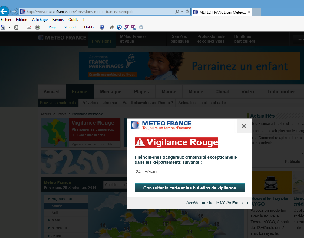 Le département de l’Hérault en vigilance rouge, le lundi 29 septembre 2014. Capture d’écran du site Météo France