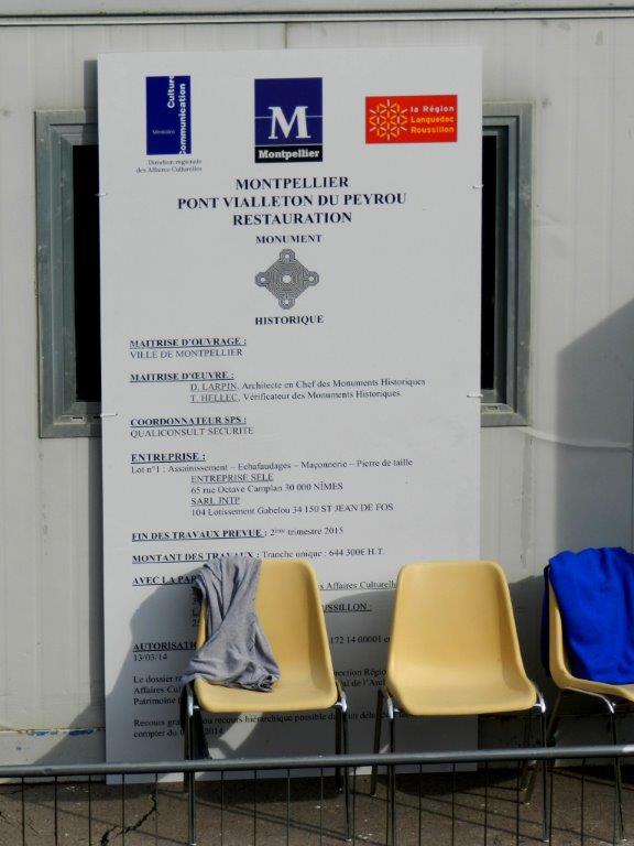 Panneau d’information sur la restauration du pont Vialleton installé contre un bungalow de chantier, boulevard du Professeur Louis-Vialleton à Montpellier. Photo prise le mardi 7 octobre 2014. Copyright : Anje34