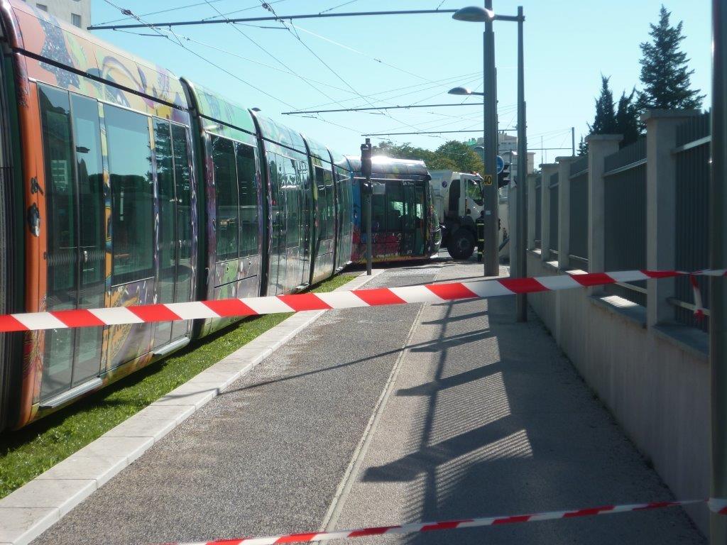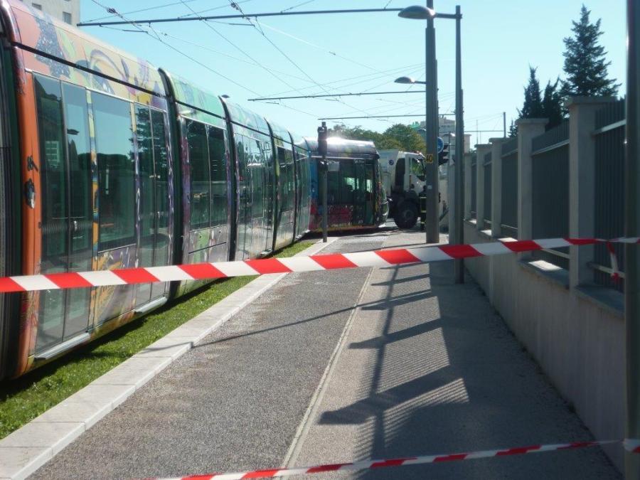 Seule la motrice de tête de la rame 2078 Citadis 402 Alstom est sortie des rails à la suite de la collision avec le camion-benne, ce vendredi 24 octobre 2014. Copyright : Edouard Paris
