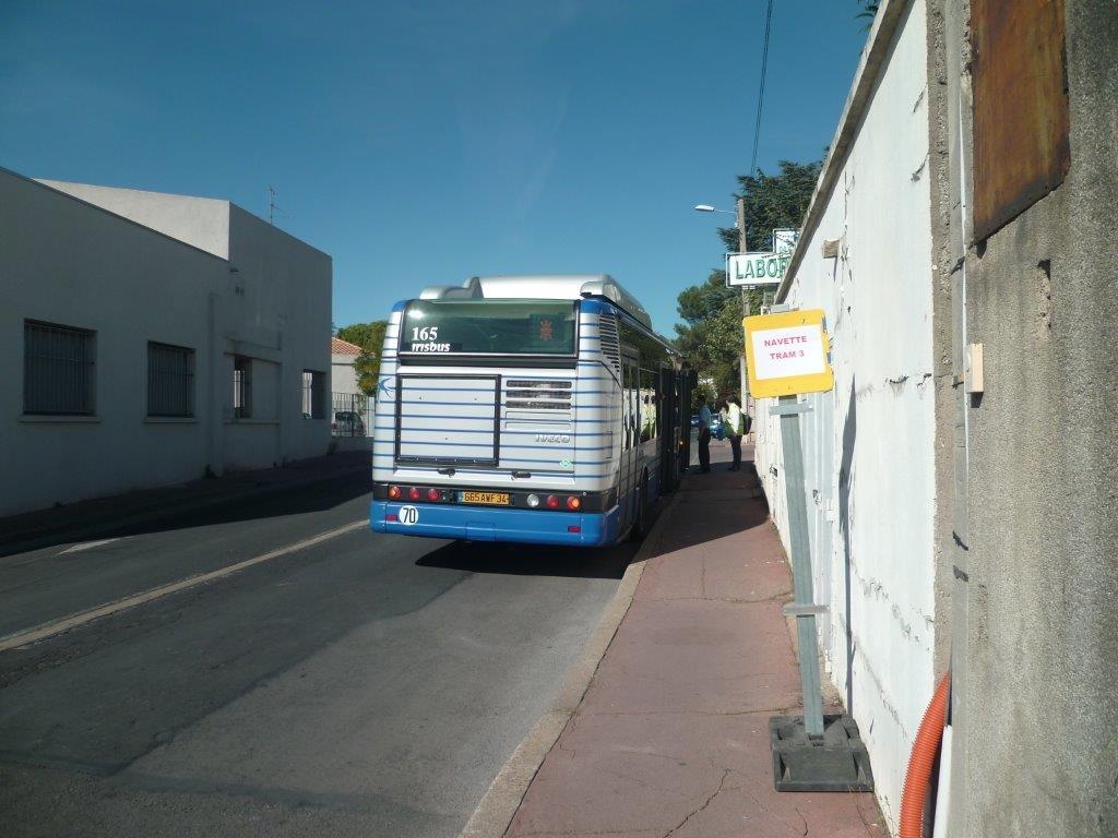 Le point de départ des navettes mises en place à la suite de la collision entre un camion-benne et une rame de tramway, avenue de Lodève à Montpellier, le vendredi 24 octobre 2014, était situé au début de la rue d’Alco dans le périmètre où sévissent les moustiques tigres vecteurs du Chikungunya. Copyright : Edouard Paris