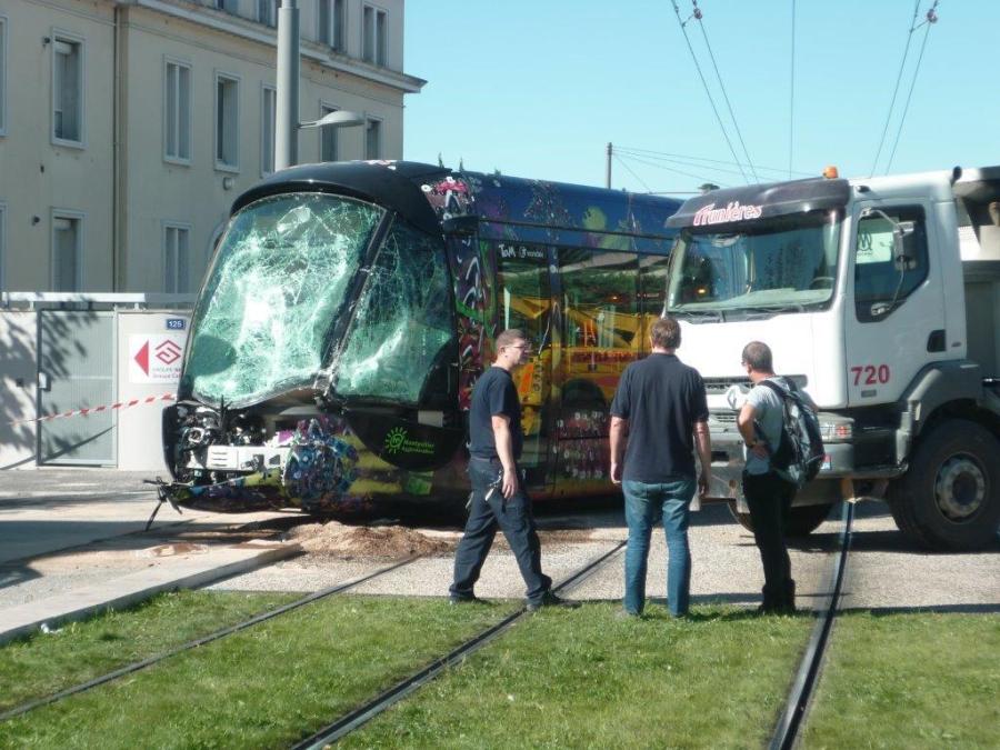 Etat de la cabine de la motrice de tête de la rame 2078 Citadis 402 Alstom à la suite du déplacement du camion-benne avec lequel elle est rentrée en collision, le vendredi 24 octobre 2014, avenue de Lodève à Montpellier, sur la ligne 3. Copyright : Edouard Paris