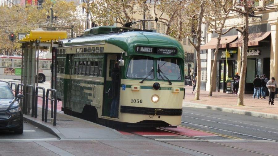 Motrice PCC 1050 Class numérotée 1050 revêtue de la livrée San Francisco Municipal Railway, photographiée le samedi 25 octobre 2014 dans Market Street à San Francisco. Copyright : DS7