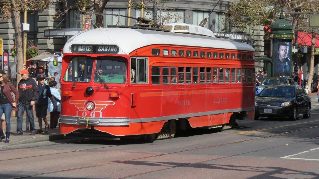Motrice PCC 1050 Class numérotée 1061 revêtue de la livrée Pacific Electric, photographiée le samedi 25 octobre 2014 dans Market Street à San Francisco. Copyright : DS7