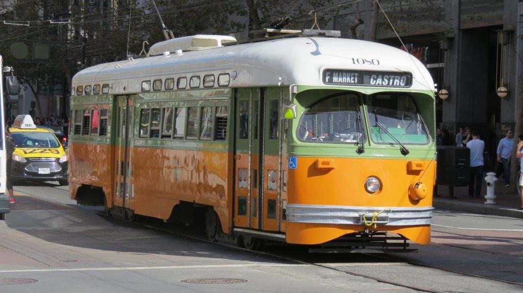 Motrice PCC 1070 Class numérotée 1080 revêtue de la livrée Los Angeles Transit Lines, photographiée le samedi 25 octobre 2014 sur Market Street à San Francisco. Copyright : DS7