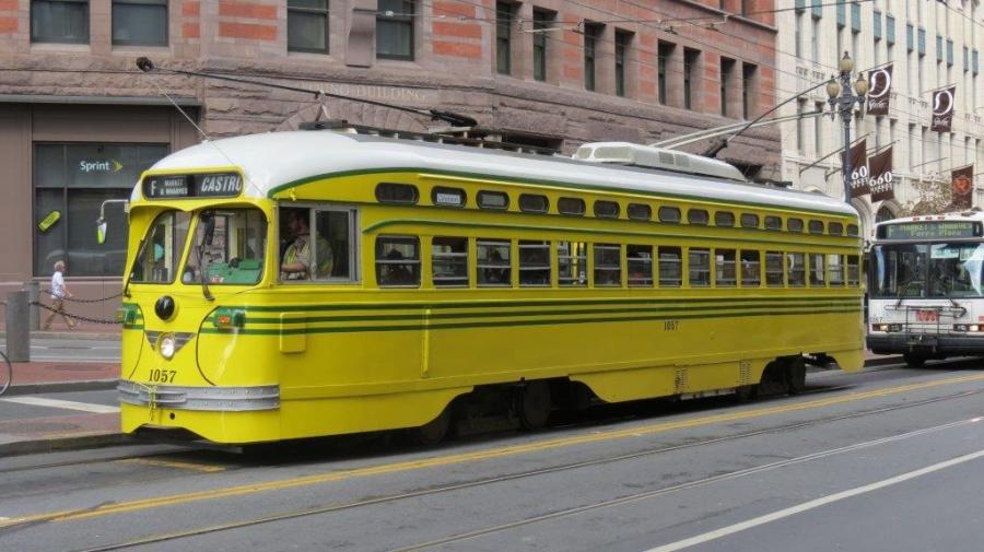 Motrice PCC 1050 Class numérotée 1057 revêtue de la livrée Cincinnati, Ohio, photographiée le samedi 25 octobre 2014 dans Market Street à San Francisco. Copyright : DS7
