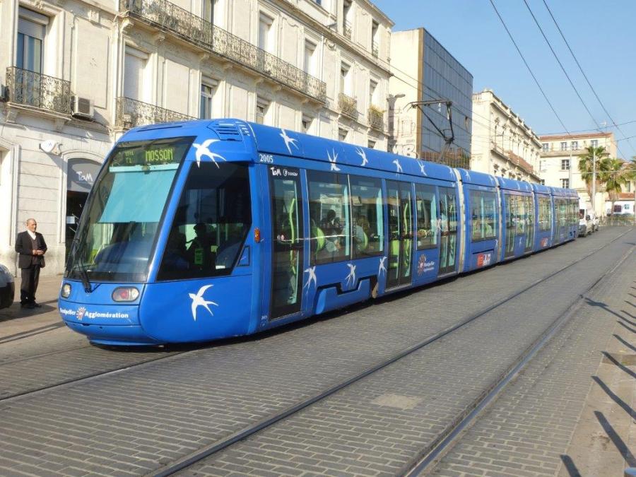La rame 2005 Citadis 401 Alstom circule désormais avec les logos dépareillés des partenaires financiers, région Languedoc-Roussillon, Etat et département de l’Hérault. Photo prise le vendredi 31 octobre 2014, rue Jules-Ferry à Montpellier. Copyright : Louis Ferdinand