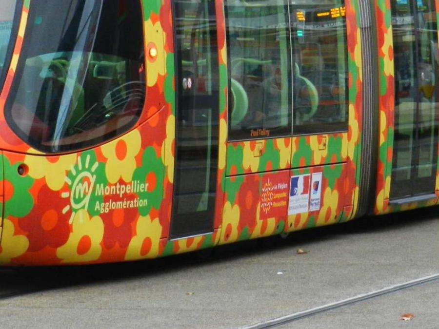Gros plan sur les logos des quatre partenaires financiers du réseau de tramway de Montpellier, dont les trois derniers ont été appliqués sans aucune recherche en esthétique. Photo prise le vendredi 14 novembre 2014. Copyright : Anje34