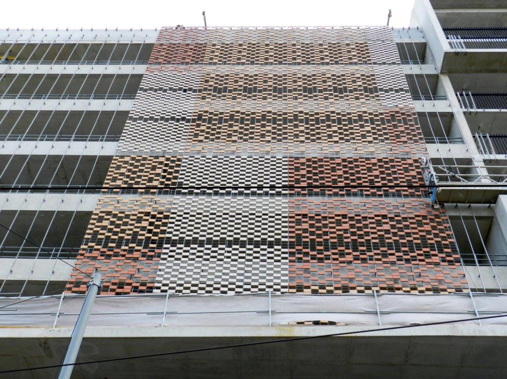 La façade du futur parking silo Le Nouveau Saint-Roch qui surplombe les voies des lignes 2 et 4 de tramway, se pare elle aussi de rideaux de briques de céramique percés sur 50 % de leur surface. Situation au mercredi 3 décembre 2014. Copyright : Anje34