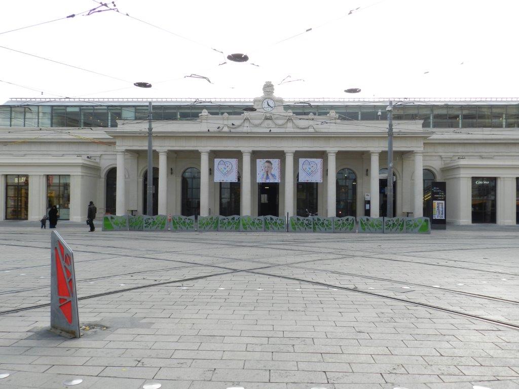 Photo de la place Auguste-Gibert carrefour stratégique des quatre lignes de tramway et de la façade ravalée de style néoclassique de la gare historique, le mercredi 3 décembre 2014. Copyright : Anje34