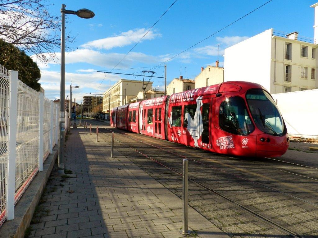 La rame 2048 Citadis 302 Alstom à la livrée « La Sunny French Tech Attitude » approche de la station « Rondelet », le mardi 16 décembre 2014 huitième anniversaire de la ligne 2. Copyright : Anje34