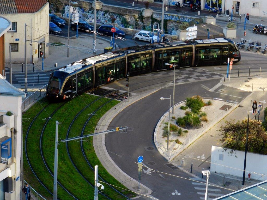 La rame 2049 Citadis 302 Alstom multiligne est photographiée alors qu’elle entame la courbe serrée qui précède la station « Corum », le mardi 16 décembre 2014 huitième anniversaire de la ligne 2. Copyright : Anje34