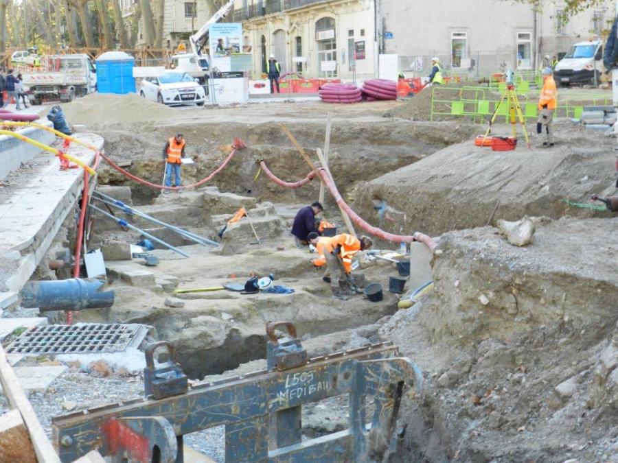 Place Albert 1er à Montpellier, le mardi 16 décembre 2014. Les fouilles archéologiques ont repris de plus belle. Copyright : Anje34