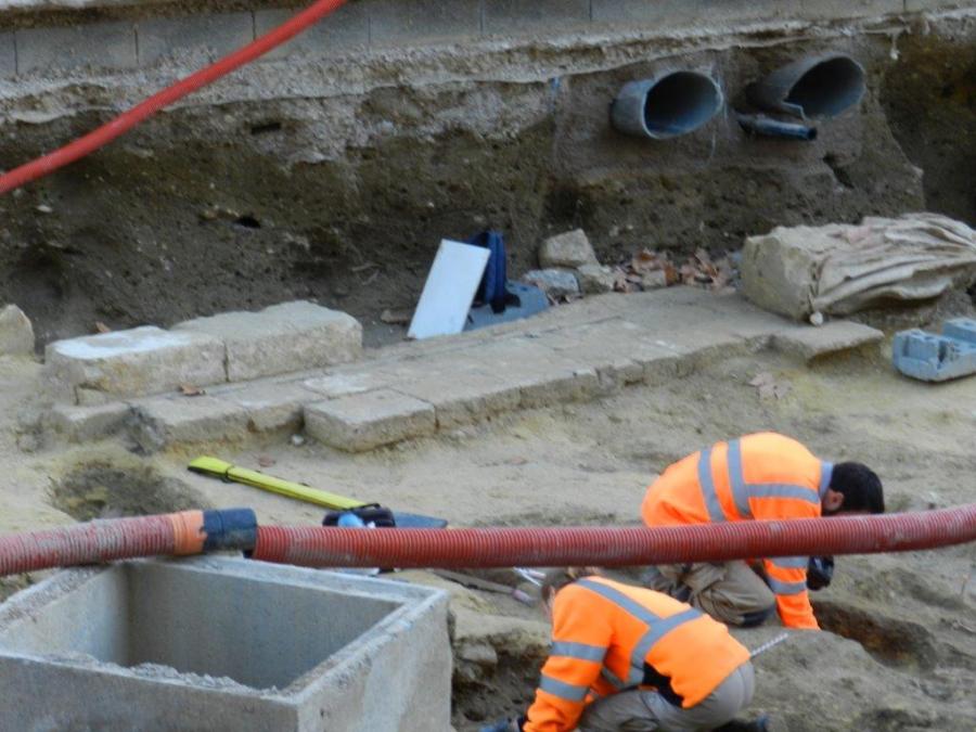 Place Albert 1er à Montpellir, le mardi 16 décembre 2014, des archéologues de l’Inrap ont oublié leur casque de sécurité aux vestiaires. Copyright : Anje34