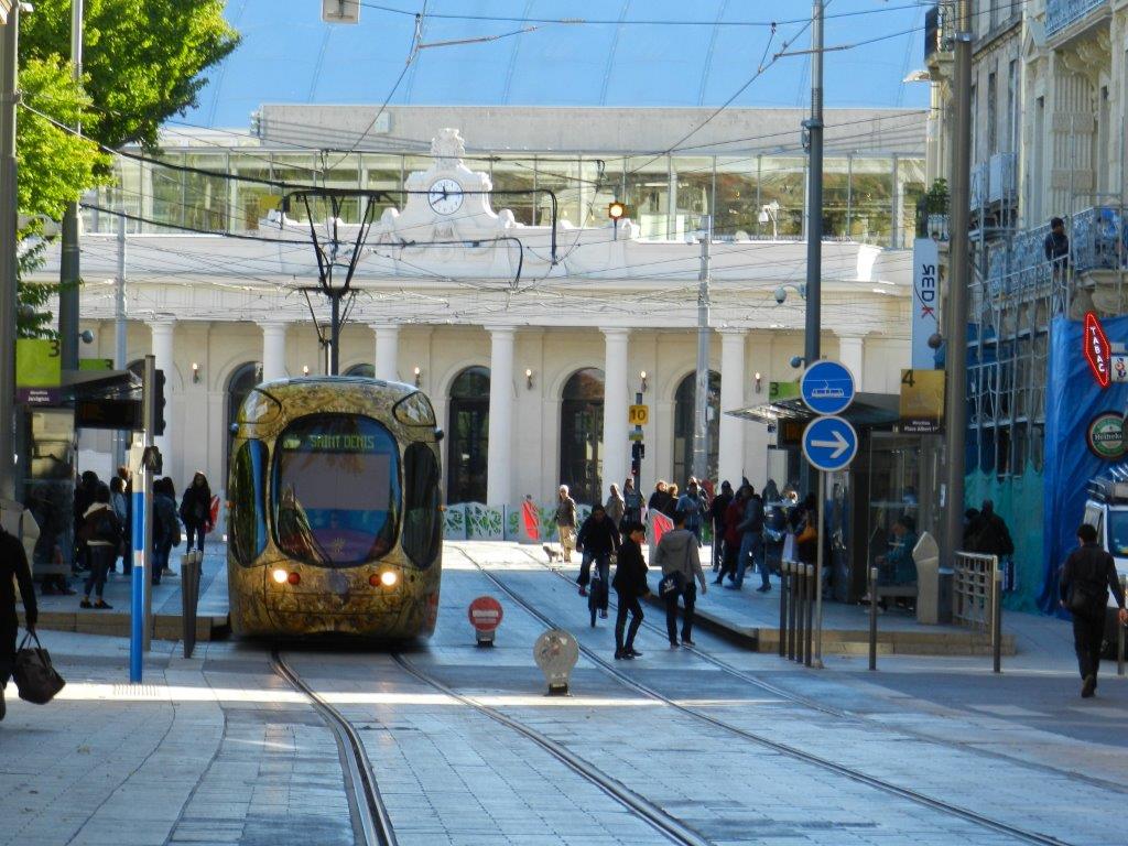 Les rames à la livrée « Roi Soleil » signée Christian Lacroix ne devraient pas emprunter le chaînon manquant Place Edouard-Adam – Place Albert 1er, en service commercial, avant le début 2017. Photo prise le jeudi 6 novembre 2014, rue de la République à Montpellier
