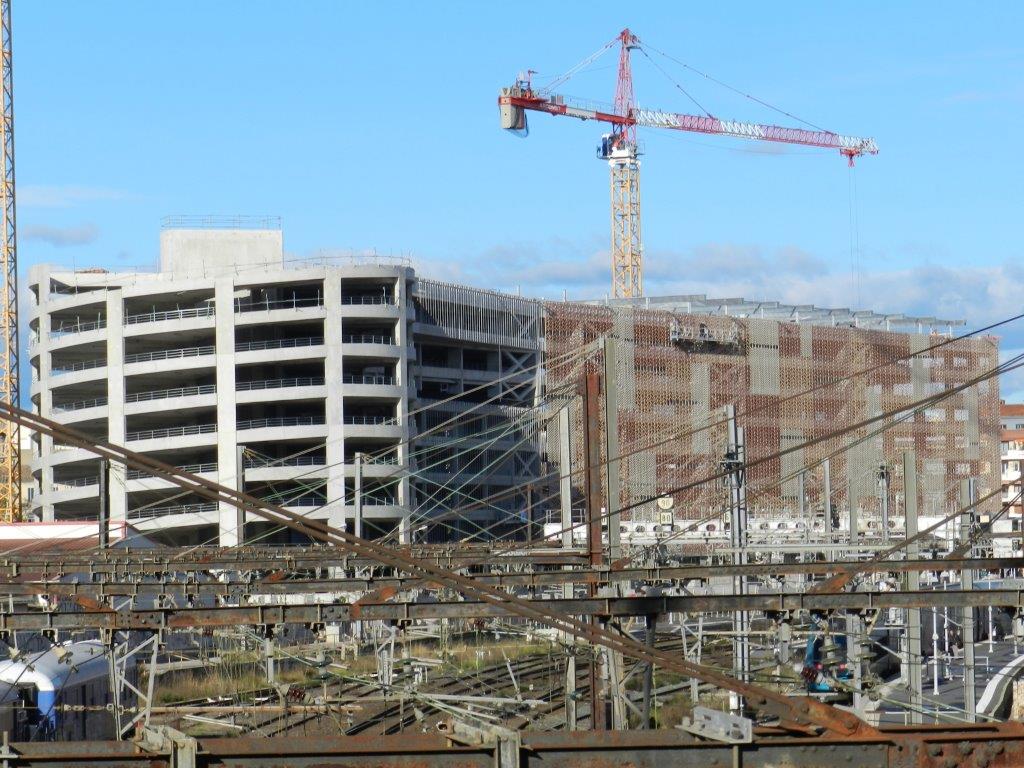 Depuis le boulevard Vieussens à Montpellier, on aperçoit les structures en cours d’assemblage des premières pergolas au dernier niveau du futur parking silo Le Nouveau Saint-Roch. Photo prise le mardi 16 décembre 2014. Copyright : Anje34