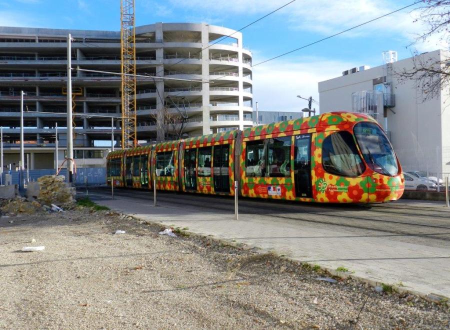 La rame 2058 Citadis 302 Alstom va passer au pied du futur parking silo Le Nouveau Saint-Roch à Montpellier. Photo prise le mardi 16 décembre 2014. Copyright : Anje34
