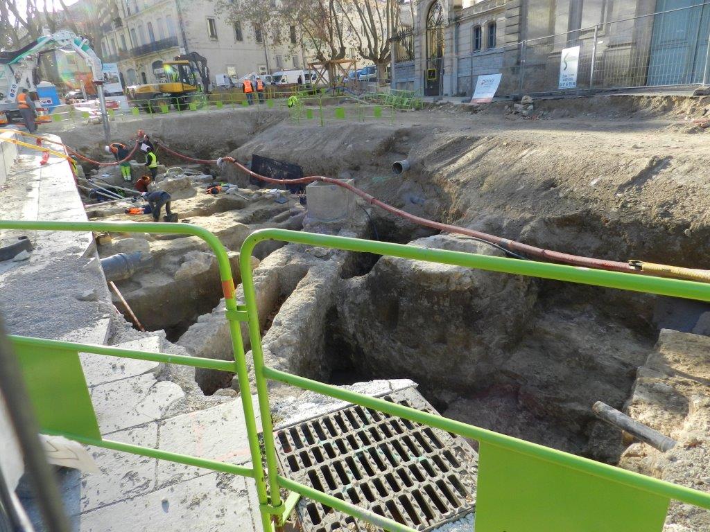 Chantier de fouilles archéologiques de la place Albert 1er à Montpellier, dans le cadre des travaux de bouclage de la ligne 4 de tramway, le jeudi 8 janvier 2015. Copyright : Anje34