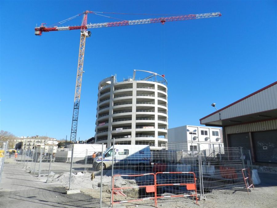 Une grue de grande hauteur assure l’assemblage des structures métalliques au sommet de la rampe hélicoïdale du futur parking silo Le Nouveau Saint-Roch, le lundi 12 janvier 2015. Copyright : Anje34