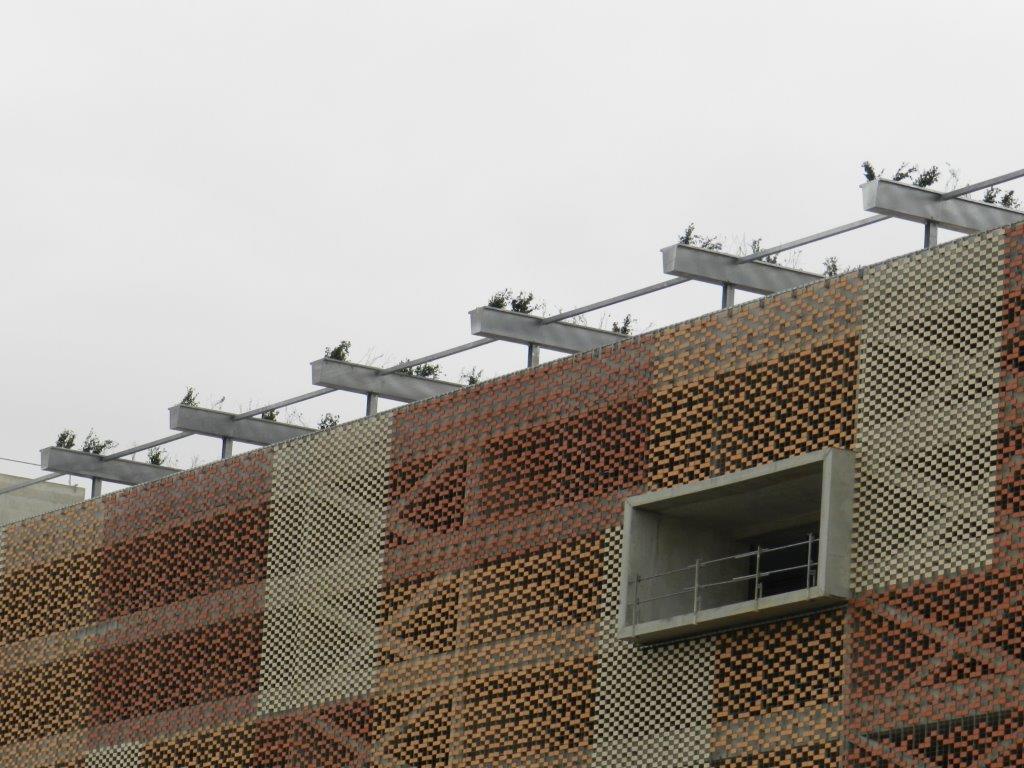 Aperçu de végétaux sur les poutres installées au dernier niveau du futur parking silo Le Nouveau Saint-Roch à Montpellier, le mercredi 21 janvier 2015. Copyright : Anje34
