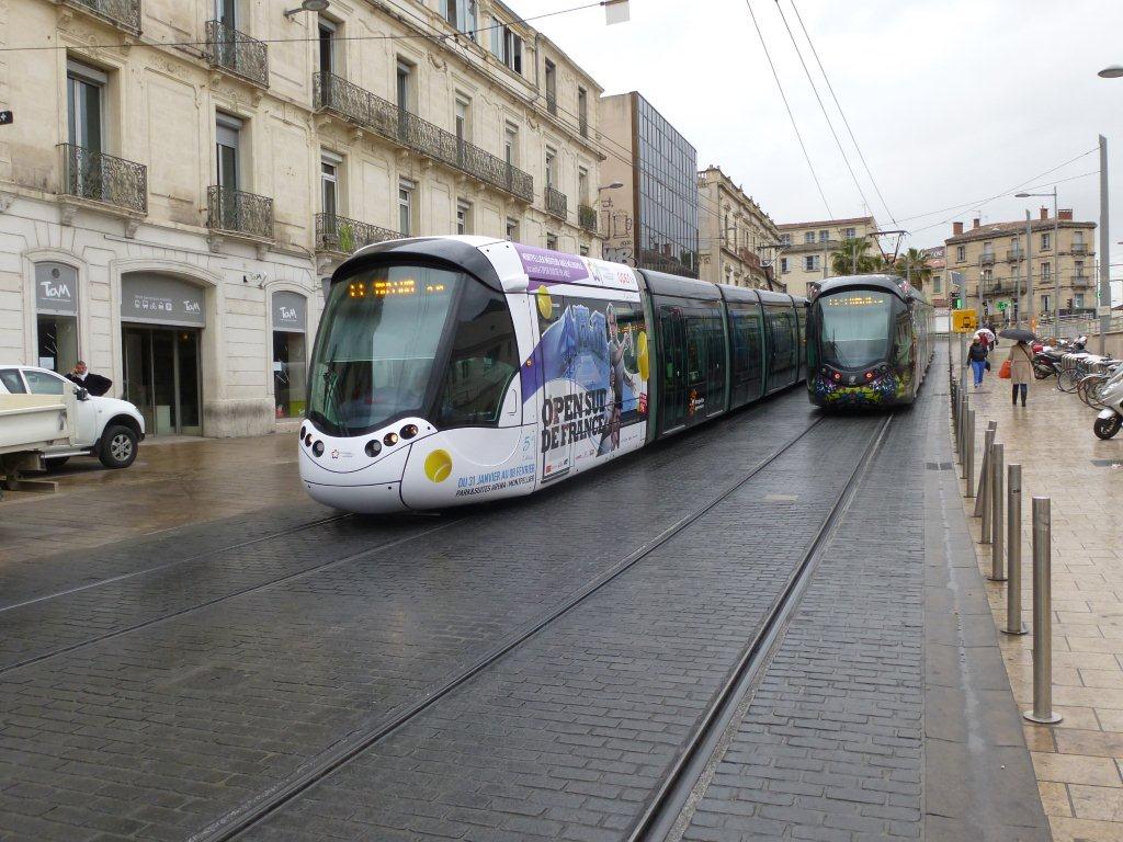 La rame 2099 Citadis 402 Alstom multiligne dont les deux motrices sont aux couleurs de l’Open Sud de France 2015, est photographiée rue Jules-Ferry à Montpellier, le jeudi 29 janvier 2015. Copyright : Louis Ferdinand