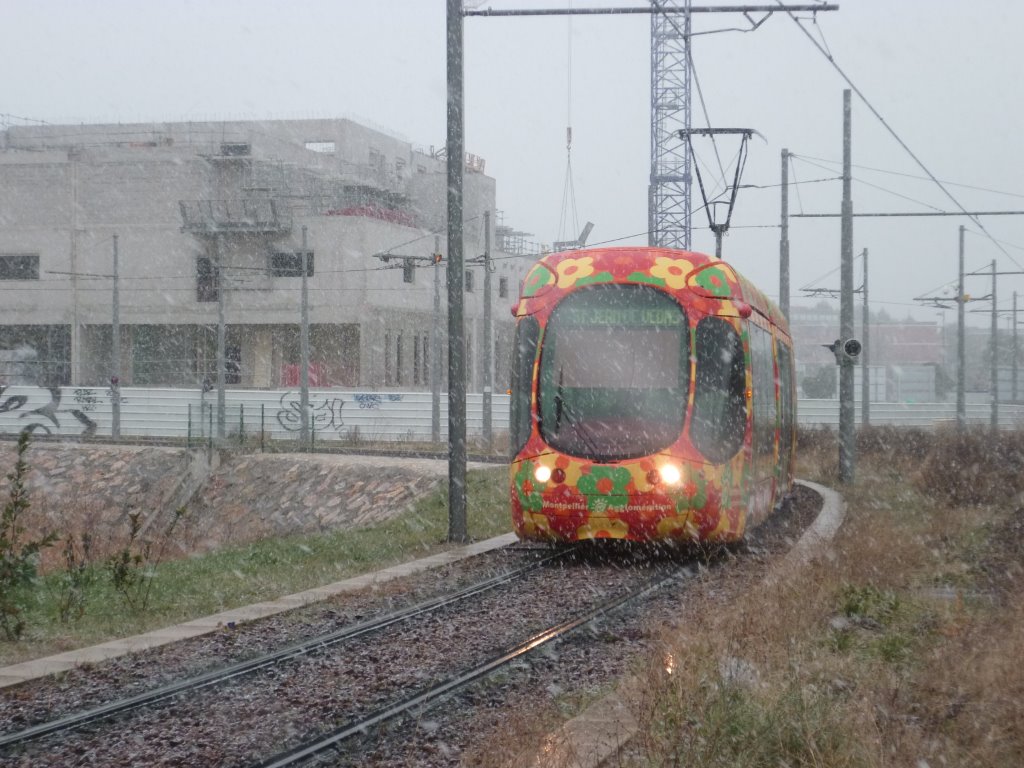 Averse de neige prononcée au moment où la rame 2054 Citadis 302 Alstom emprunte le faux triangle des Sabines à Montpellier en direction de Saint Jean de Védas – Centre, sur la ligne 2, à 12h24, le mardi 3 février 2015. Copyright : Edouard Paris