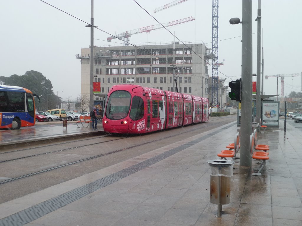 En arrière plan, un des bâtiments de la future polyclinique Saint-Roch dont la façade donne sur le parking relais « Sabines » jouxtant la station éponyme de la ligne 2. Photo prise le mardi 3 février 2015. Copyright : Edouard Paris