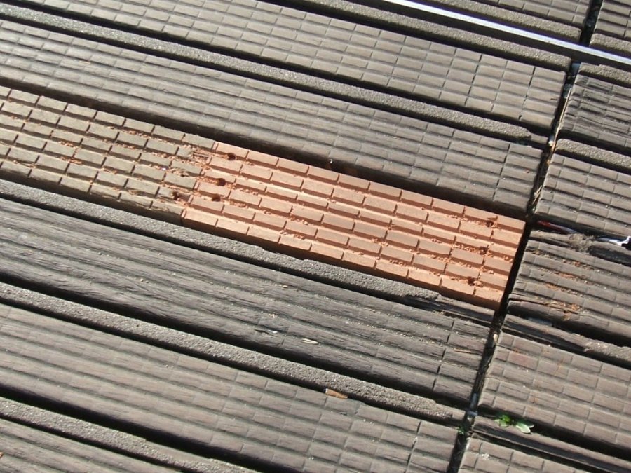 Gros plan sur la nouvelle pièce de bois de teck posée sur le quai direction « Mosson » de la station « Du Guesclin » de la ligne 1, le vendredi 20 février 2015. Copyright : Anje34