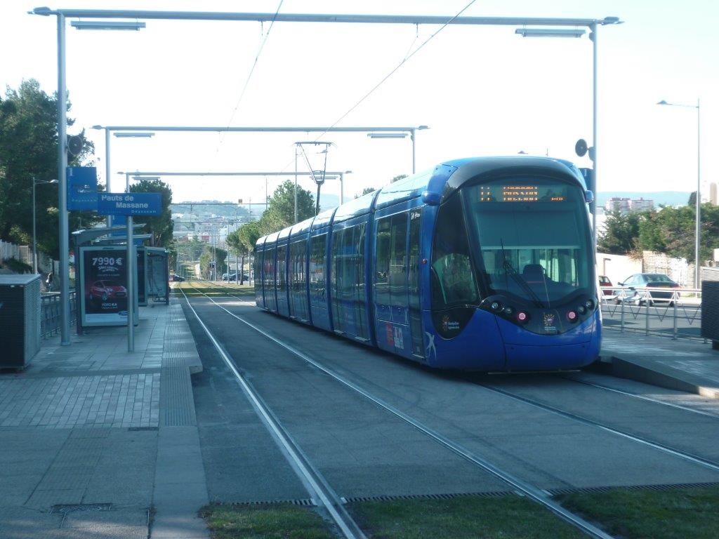La rame 2090 Citadis 402 Alstom est photographiée à la station « Hauts de Massane » de la ligne 1, le samedi 28 février 2015. Copyright : Edouard Paris