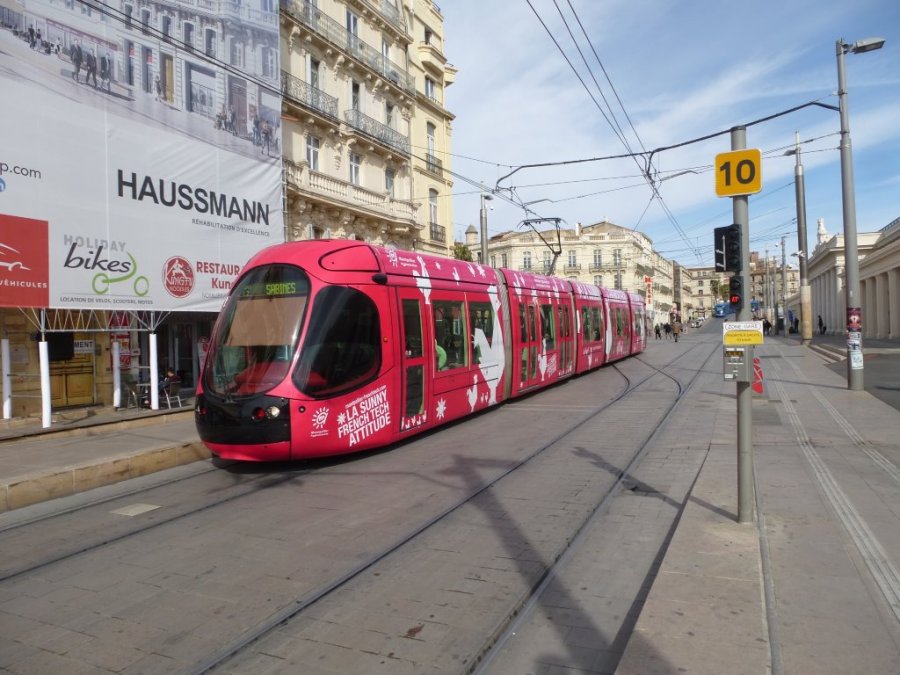 Museau noir pour une des deux motrices de la rame 2048 Citadis 302 Alstom multiligne photographiée rue Jules-Ferry à Montpellier , le samedi 28 février 2015. Copyright : Louis Ferdinand