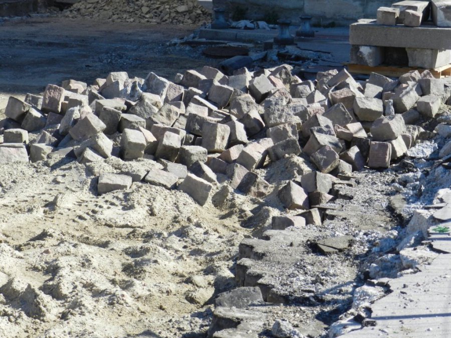 Amoncellement de vieux pavés au pied de l’arc de triomphe de Montpellier, le samedi 28 février 2015. Copyright : Anje34