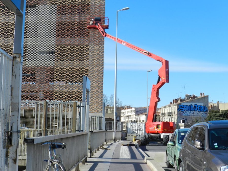 Installation d’un raccord de rideau de briques de céramique percé sur 50 % de sa surface côté Pont-de-Sète, le mercredi 25 février 2015. Copyright : Anje34