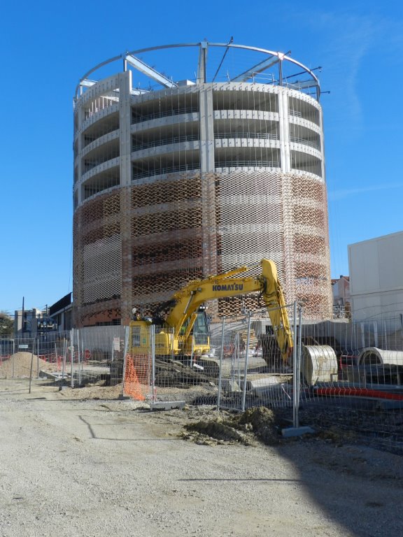Situation de l’habillage en cours de réalisation de la tour abritant la rampe hélicoïdale d’accès aux niveaux du futur parking silo Le Nouveau Saint-Roch, le samedi 28 février 2015. Copyright : Anje34