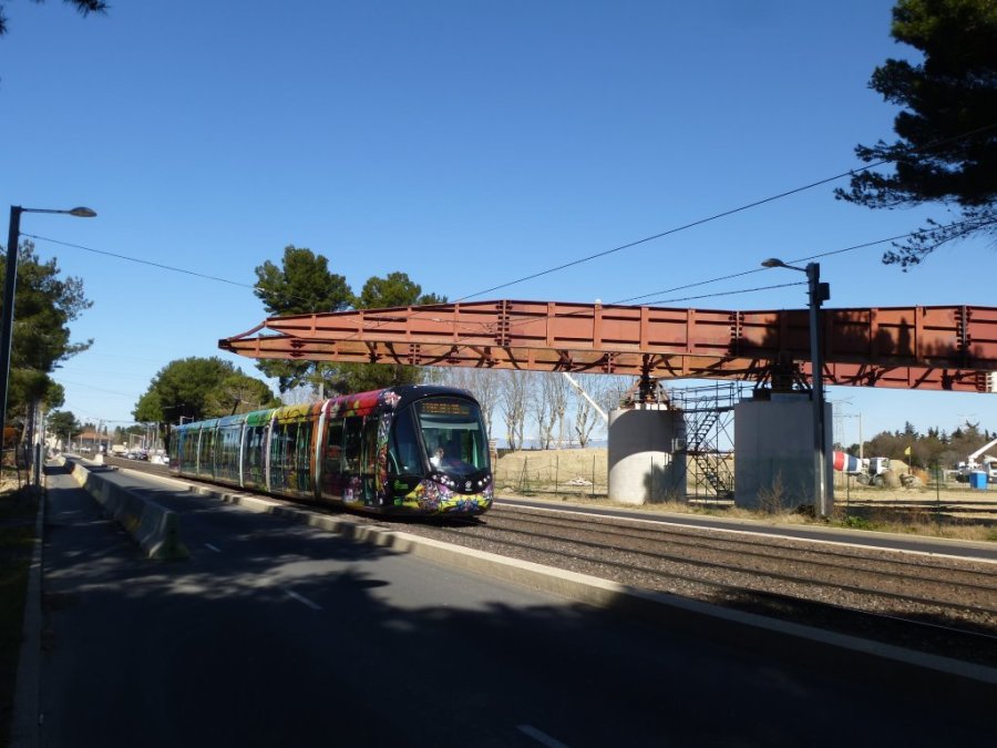 Au-dessus de la rame 2086 Citadis 402 Alstom, l’avant bec du tablier métallique d’un des viaducs ferroviaires du contournement de Nîmes et Montpellier. Photo prise le jeudi 5 mars 2015. Copyright : Louis Ferdinand