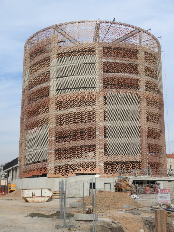 Habillage de la tour qui abrite la rampe hélicoïdale d’accès aux niveaux du futur parking silo Le Nouveau Saint-Roch. Photo prise le mardi 10 mars 2015. Copyright : Anje34