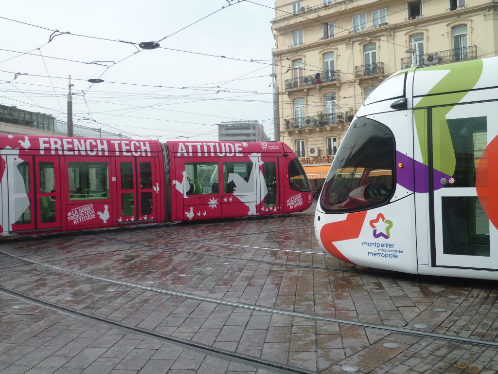 Place Auguste-Gibert à Montpellier, le vendredi 20 mars 2015, à 10h45 pile, la rame 2049 Citadis 302 Alstom multiligne à la livrée « Montpellier Méditerranée Métropole » cède le passage à la rame 2048 Citadis 302 Alstom multiligne à la livrée « La Sunny French Tech Attitude ». Copyright : Edouard Paris