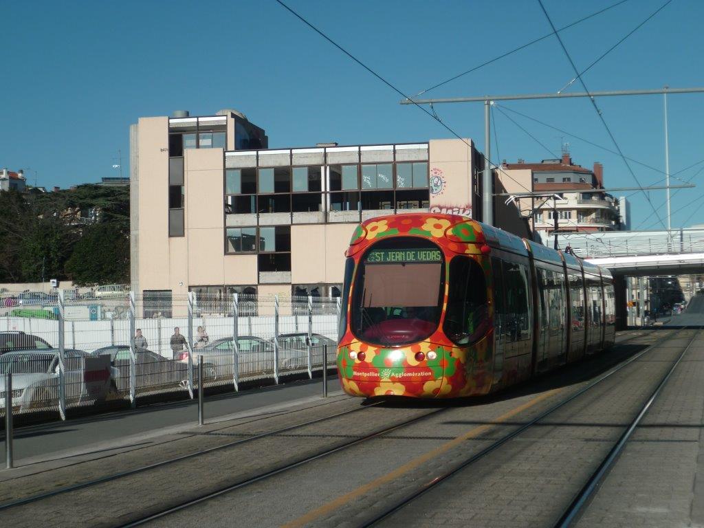 Rue Alexandra David-Néel à Montpellier, la rame 2064 Citadis 302 Alstom passe devant le bâtiment des anciens bureaux du Sernam dont les jours sont désormais comptés. Photo prise le dimanche 22 février 2015. Copyright : Edouard Paris